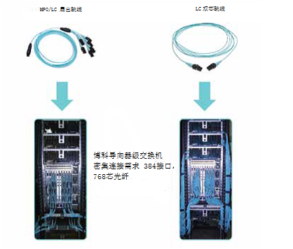 網(wǎng)絡(luò)交換產(chǎn)品可用的SFP+接口卡達(dá)到48個(gè),每個(gè)機(jī)架式交換機(jī)使用超過1000芯OM3/OM4光纖為10G雙芯光纖串行運(yùn)作。預(yù)計(jì)未來40 /100G交換機(jī)使用每機(jī)架超過4000芯的光纖來部署并行光學(xué)。網(wǎng)絡(luò)電子設(shè)備高芯數(shù)需求需要高密度光纜和硬件解決方案來最大化利用的路徑和空間,緩解光纜管理和簡化連接到系統(tǒng)的電子設(shè)備。