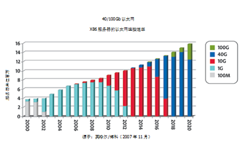 每臺(tái)服務(wù)器增加一定數(shù)量的應(yīng)用,會(huì)產(chǎn)生=>10G的吞吐量的需求。根據(jù)服務(wù)器的帶寬要求,一個(gè)8核處理器可以驅(qū)動(dòng)幾十Gb/s的帶寬。也就是說需要更高數(shù)據(jù)傳輸速率的網(wǎng)絡(luò)基礎(chǔ)設(shè)施,以適應(yīng)更高級(jí)別的服務(wù)器I/O性能。圖2提供了一個(gè)服務(wù)器連接速度預(yù)測(cè)(10G,40G和100G)。預(yù)計(jì)在未來兩年里10G將會(huì)快速的應(yīng)用在服務(wù)器和網(wǎng)絡(luò)交換機(jī)上,如核心和匯聚交換機(jī)。