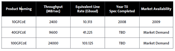 表1提供了光纖通道行業(yè)協(xié)會(huì)(FCIA)對(duì)FCoE速度路徑的路線圖。在10GFCoE利用串行雙路光纖傳輸,40/100GFCoE速度需要并行光學(xué)來實(shí)現(xiàn)。