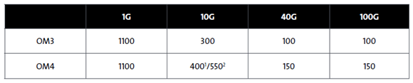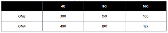 表2提供了OM3-和OM4-規(guī)定的以太網(wǎng)和光纖通道的距離。以太網(wǎng)每個(gè)距離假設(shè)1.5dB總連接器損耗除了OM440/100G的情況,光纖通道假設(shè)1.0dB總連接器的損耗。OM3和OM4完全有能力支持現(xiàn)有的和新興數(shù)據(jù)傳輸速率,因此物理層預(yù)期會(huì)有15-20年的使用壽命。