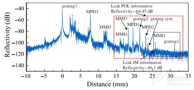 在10μm空間分辨率下獲得測試結果,硅發(fā)射器芯片內部出現(xiàn)幾個反射峰。光柵序號與對應通道序號相同。為確定反射峰位置,在調制器上施加信號,對反射峰的變化情況進行觀察和分析。OCI1500實現(xiàn)對芯片內各器件的識別、定位及回損的測量。