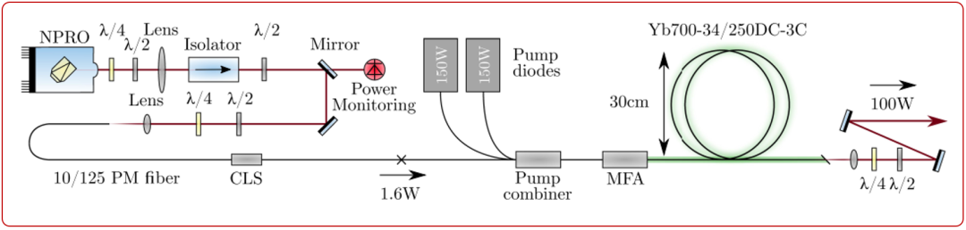 2019年,Sven Hochheim等人用nLight的Yb700-34/250的3C光纖,制作了用于引力波探測的100W單頻單模保偏光纖放大器。