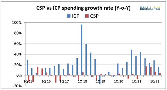 位于食物鏈頂端的CSP(通信服務(wù)提供商)和ICP(互聯(lián)網(wǎng)內(nèi)容提供商)均報(bào)告稱,與2021年同期相比,資本開支均有所增加。但是,如下圖所示,在過去幾個(gè)季度中,這兩個(gè)群體的資本支出增速一直在放緩,因此今年第三季度和第四季度資本支出同比持平或下滑也就不足為奇了。