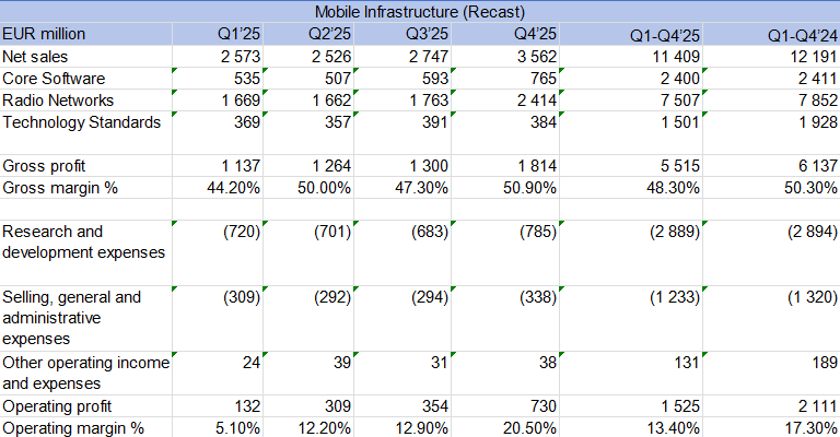 諾基亞自2026年第一季度財務業(yè)績起將按照新的組織結(jié)構(gòu)報告分部財務信息。除三大運營分部的完整財務信息外,諾基亞還將披露網(wǎng)絡基礎設施和移動基礎設施分部內(nèi)各業(yè)務單元的凈銷售額信息。此外,公司將繼續(xù)提供"集團共同及其他"(Group Common and Other)的分部層面數(shù)據(jù)。