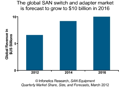 SAN適配器方面,Qlogic和Emulex占據(jù)大部分份額。2011年這兩家公司銷售收入再次實(shí)現(xiàn)健康增長,不過同時(shí)他們的對手也在穩(wěn)步向前發(fā)展。