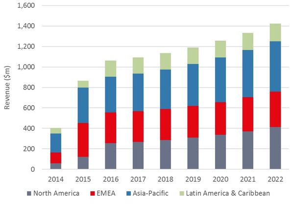 圖:2014-2022年全球各地區(qū)海底光纜收入。來(lái)源:Ovum