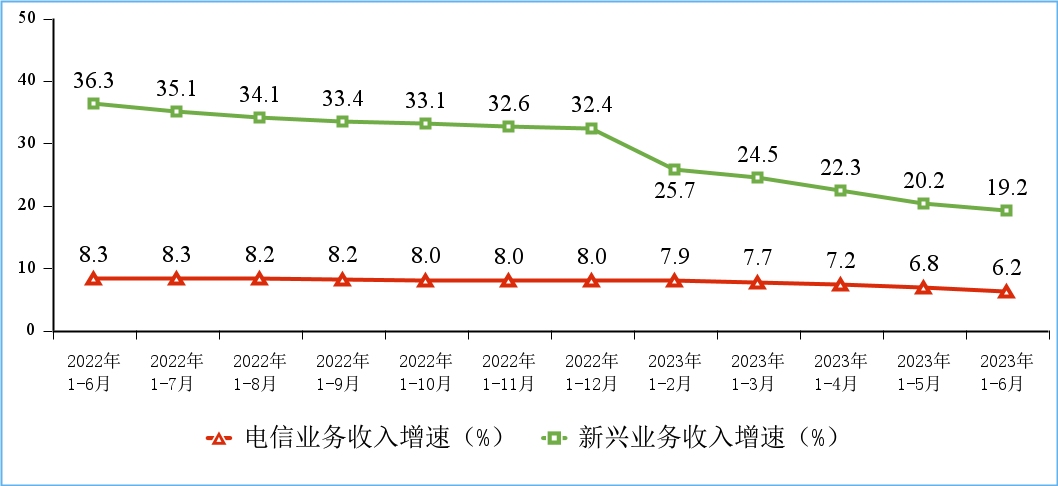 移動數(shù)據(jù)流量業(yè)務(wù)收入低速增長。上半年,三家基礎(chǔ)電信企業(yè)完成移動數(shù)據(jù)流量業(yè)務(wù)收入3356億元,同比增長0.2%,在電信業(yè)務(wù)收入中占比為38.6%,拉動電信業(yè)務(wù)收入增長0.1個百分點。