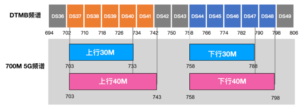 如上圖,廣電之前擁有的700M頻譜資源主要用于數(shù)字電視地面廣播(DTMB),DTMB頻道為8M帶寬,與700M 5G沖突的頻道為DS36至DS49頻道。