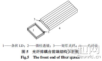 斜角光纖耦合技術(shù)和棱鏡耦合技術(shù)屬于同一種泵浦原理的耦合技術(shù),但就工藝難度相比而言,斜 角光纖耦合技術(shù)最容易實(shí)現(xiàn)。根據(jù)有關(guān)理論分析,斜角光纖的耦合效率與端面斜角有關(guān),最大耦合效率時(shí)存在唯一一個(gè)最佳角度,該最大耦合效率值與光纖參數(shù)有 關(guān)。另外,斜角光纖耦合技術(shù)對(duì)于非尾纖輸出的條狀半導(dǎo)體激光器泵浦光的耦合特別有效,將數(shù)根矩形光纖或玻璃絲排列成光纖排,前端面與條狀LD 輸出面通過微柱透鏡耦合(見圖5),后端的光纖或玻璃絲各自獨(dú)立,每根末端均磨成斜角,分別在雙包層光纖內(nèi)包層側(cè)面的不同位置耦合,適用于多點(diǎn)泵浦。
