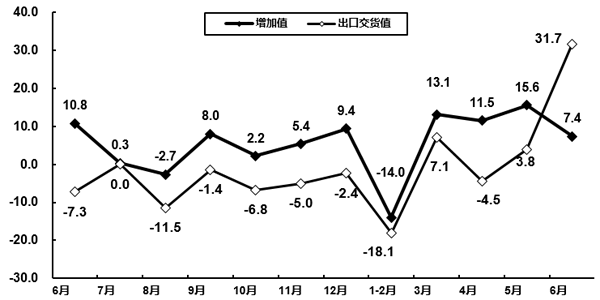 2020年6月通信設(shè)備行業(yè)增加值和出口交貨值分月增速(%)