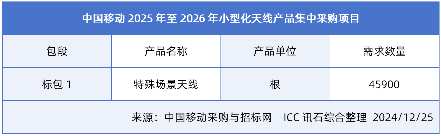 ICC訊 近日,中國移動發(fā)布“2025年至2026年室分天線產品集中采購項目”與“2025年至2026年小型化天線產品集中采購項目”兩則天線集采公告。