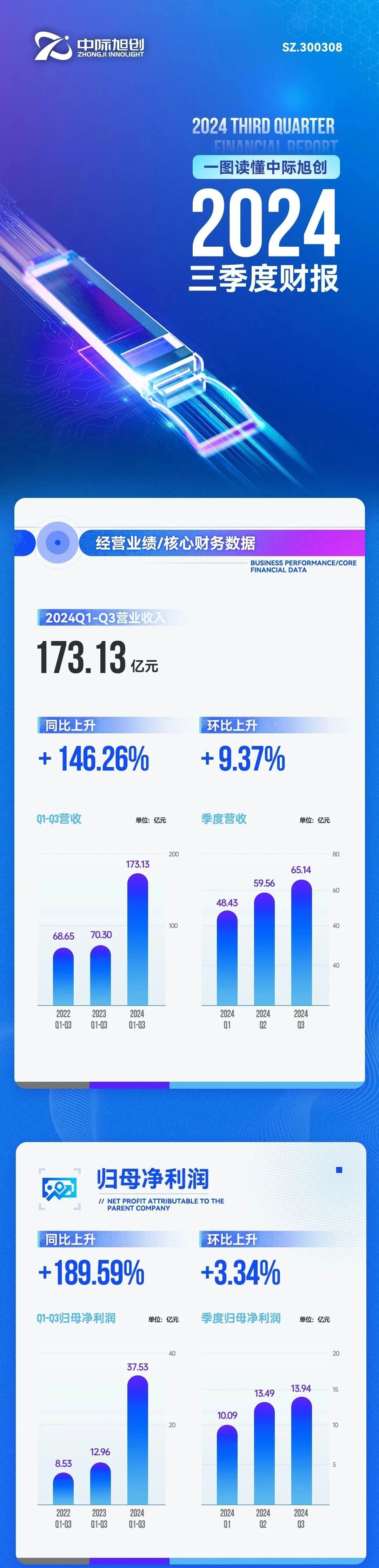 ICC訊 10月22日,中際旭創(chuàng)股份有限公司(簡稱中際旭創(chuàng))發(fā)布2024年三季度財報,2024年前三季度累計營業(yè)收入173.13億元,同比上升146.26%,環(huán)比上升9.37%,歸母凈利潤為37.53%,同比增長189.59%,凈利潤率為21.68%。其中,第三季度營收65.14億元,歸母凈利潤為13.94億元,凈利潤為21.40%。