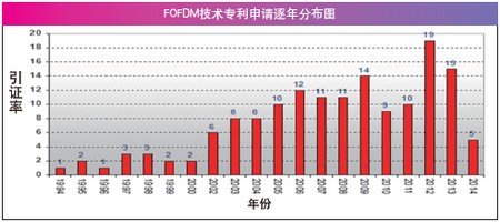 同看到的技術(shù)文獻相同,從上世紀90年代開始FOFDM技術(shù)開始發(fā)展(專利申請在發(fā)表文章前才具有新穎性,才能獲得授權(quán)),從2002年開始相關(guān)技術(shù)有一定增長,從2012年開始專利申請有了進一步地小幅增長。