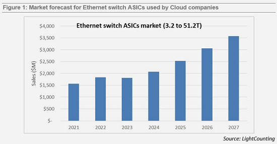 LightCounting(LC)于2022年4月首次發(fā)布關(guān)于以太網(wǎng)交換機(jī)ASIC的報(bào)告,并在近日發(fā)布了第一次更新。該報(bào)告涵蓋了交換ASIC市場(chǎng)中最有趣的部分——部署在云數(shù)據(jù)中心的高帶寬(3.2T及以上)、低延遲芯片。該報(bào)告簡要介紹了商用交換機(jī)ASIC的主要供應(yīng)商和向云公司提供產(chǎn)品的系統(tǒng)集成商,并預(yù)測(cè)了3.2-51.2T交換機(jī)ASIC的銷售。