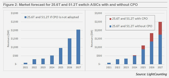 報(bào)告中討論的一個(gè)場(chǎng)景考慮了云公司在25.6T和51.2T以太網(wǎng)交換機(jī)中采用共封裝光學(xué)器件(CPO)。假設(shè)15%的25.6T和51.2T交換芯片將有一半的端口配備CPO,那么2027年的市場(chǎng)規(guī)模將增加5億美元,從20億美元增加到25億美元。由于對(duì)交換ASIC的定價(jià)進(jìn)行了修改,采用CPO的影響沒有LC在2022年4月發(fā)布的本報(bào)告第一版中估計(jì)的那么大。