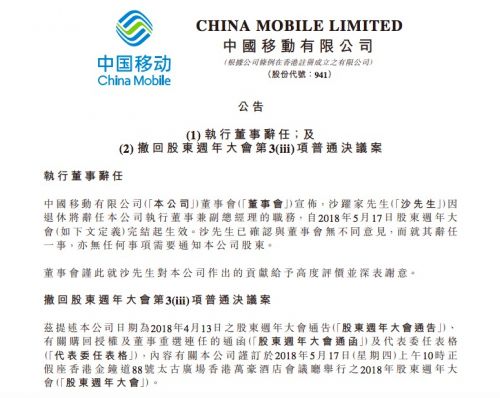 中國移動有限公司近日發(fā)布公告稱,沙躍家因退休將辭任公司執(zhí)行董事兼副總經(jīng)理的職務(wù)。自2018年5月17日股東周年大會完結(jié)起生效。
