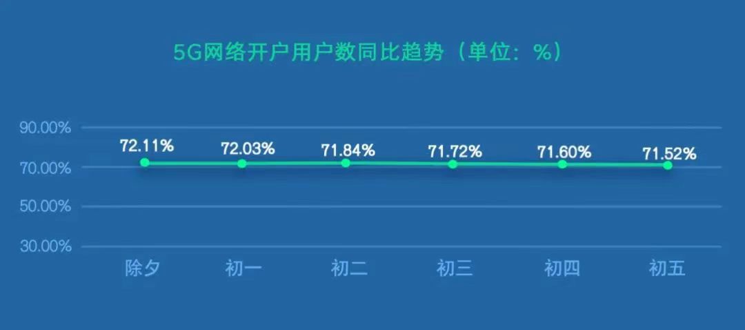 從網(wǎng)絡(luò)流量維度來看,全國5G日均流量同比(同比:與2022春節(jié)數(shù)據(jù)相比)提升60%左右,除夕當(dāng)天流量達(dá)到春節(jié)期間最高值,同比提升超過60%。5G流量的大幅增加,反映出5G正在加速融入百姓的日常生活,成為拉動新型信息消費的重要方式之一。
