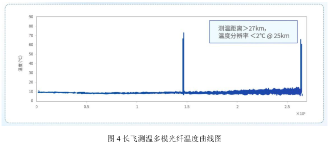 性能優(yōu)化后的測溫多模光纖結(jié)合長飛DTS主機測試結(jié)果顯示,溫度曲線平整,測溫距離在25km時,溫度分辨率優(yōu)于2℃,空間分辨率約2-3米。另外,此光纖還做了抗彎和耐高溫涂層處理,使該光纖更適合成纜以及高溫應用。