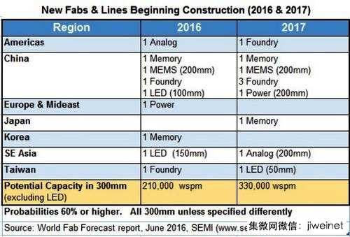 以晶圓尺寸來(lái)看,那19座晶圓廠(生產(chǎn)線)中有12座是12寸(300mm)、4座是8寸(200mm),還有3座是LED廠,分別是6寸(150mm)、4寸(100mm)與2寸(50mm)。不包括LED廠在內(nèi),新晶圓廠(生產(chǎn)線)的安裝產(chǎn)能,估計(jì)在2016年開始興建的可達(dá)到每月12萬(wàn)片初始晶圓(12寸約當(dāng)),2017年開始興建的則可達(dá)到每月33萬(wàn)片初始晶圓(12寸約當(dāng))。