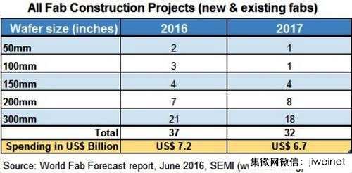 下表是SEMI列出的所有2016與2017年新晶圓廠(依尺寸)興建計(jì)畫──包括尚未動(dòng)工以及進(jìn)行中的;估計(jì)總支出金額達(dá)到139億美元。