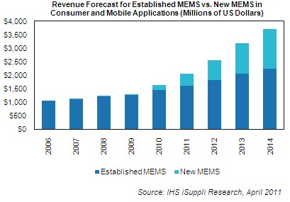 IHS公司分析師表示,2011年預(yù)計(jì)MEMS器件的銷售額將達(dá)到4.573億美元,比2010年的1.776億美元增長(zhǎng)了約2.5倍。新的MEMS領(lǐng)域還包括3軸陀螺儀和微型投影設(shè)備等產(chǎn)品,這在2006年是不存在的。到2014年,全新的MEMS市場(chǎng)規(guī)模將達(dá)到14億美元。
