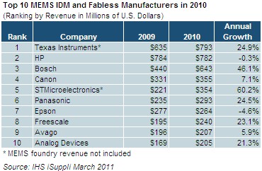 【訊石光通訊咨詢網(wǎng)】現(xiàn)在,與MEMS有關(guān)的討論越來(lái)越多。它是目前半導(dǎo)體、光電產(chǎn)業(yè)快速增長(zhǎng)的業(yè)務(wù)領(lǐng)域,在未來(lái)很難想象沒(méi)有MEMS產(chǎn)品。根據(jù)消費(fèi)電子市場(chǎng)研究機(jī)構(gòu)IHS公司的預(yù)估,2011年MEMS市場(chǎng)將出現(xiàn)巨大的發(fā)展?jié)摿Γ?57.4%的增長(zhǎng)速度。