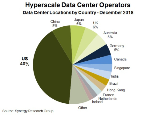 ICCSZ訊(編譯:Nina)Synergy Research的最新數(shù)據(jù)顯示,截至2018年底,超大規(guī)模提供商運(yùn)營的大型數(shù)據(jù)中心數(shù)量達(dá)到430個,年增幅11%。2018年,亞太和EMEA(歐洲、中東和非洲)地區(qū)在新開放數(shù)據(jù)中心數(shù)量方面表現(xiàn)突出,但美國擁有的大型數(shù)據(jù)中心數(shù)量仍占40%。繼美國之后最受歡迎的數(shù)據(jù)中心地點(diǎn)是中國、日本、英國、澳大利亞和德國,它們共占總數(shù)的30%。2018年期間,超大規(guī)模供應(yīng)商在17個不同的國家開設(shè)了新的數(shù)據(jù)中心,其中美國和中國香港的新增數(shù)量最多。