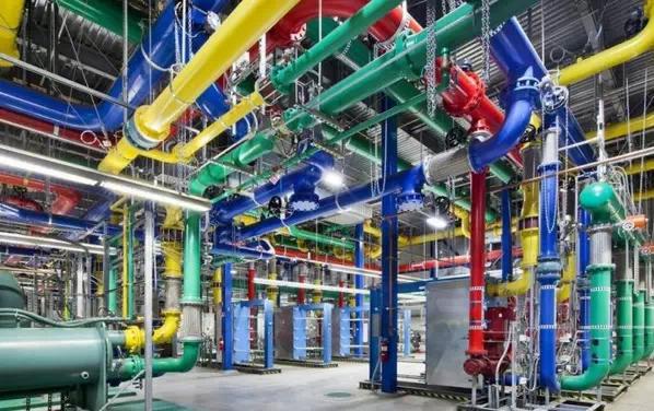 谷歌俄勒岡數(shù)據(jù)中心的這些彩色管道負(fù)責(zé)輸送水。藍(lán)色管道裝冷水,紅色管道裝熱水。