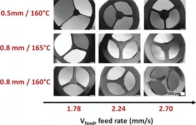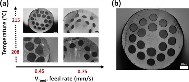 擠出后,光纖被拉過相鄰的一組輥子。這樣,在冷卻和設(shè)置時,光纖就會被拉緊,這樣,光纖內(nèi)部的任何通道就不會自行塌陷。據(jù)稱,整個過程不僅比傳統(tǒng)技術(shù)更快、成本更低、結(jié)構(gòu)更緊湊,而且纖維的長度只受限于可送入擠出機(jī)的顆粒數(shù)量。