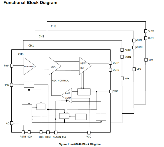 At the same time, I2C for real-time control and status reading has been integrated in ms82040. In addition, the chip provides RSSI function for monitoring and reporting average optical input power levels down to dark current. Under overload conditions, VPD provides a bias voltage that can be higher than VCC for optimal photodiode performance.