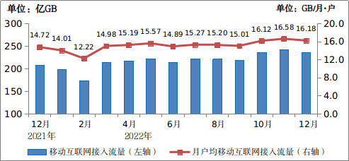 2022年,移動(dòng)互聯(lián)網(wǎng)接入流量達(dá)2618億GB,比上年增長18.1%。全年移動(dòng)互聯(lián)網(wǎng)月戶均流量(DOU)達(dá)15.2GB/戶·月,比上年增長13.8%;12月當(dāng)月DOU達(dá)16.18GB/戶,較上年底提高1.46GB/戶。