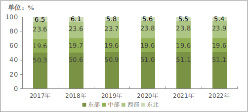 圖5-1 2017—2022年東、中、西、東北地區(qū)電信業(yè)務(wù)收入比重