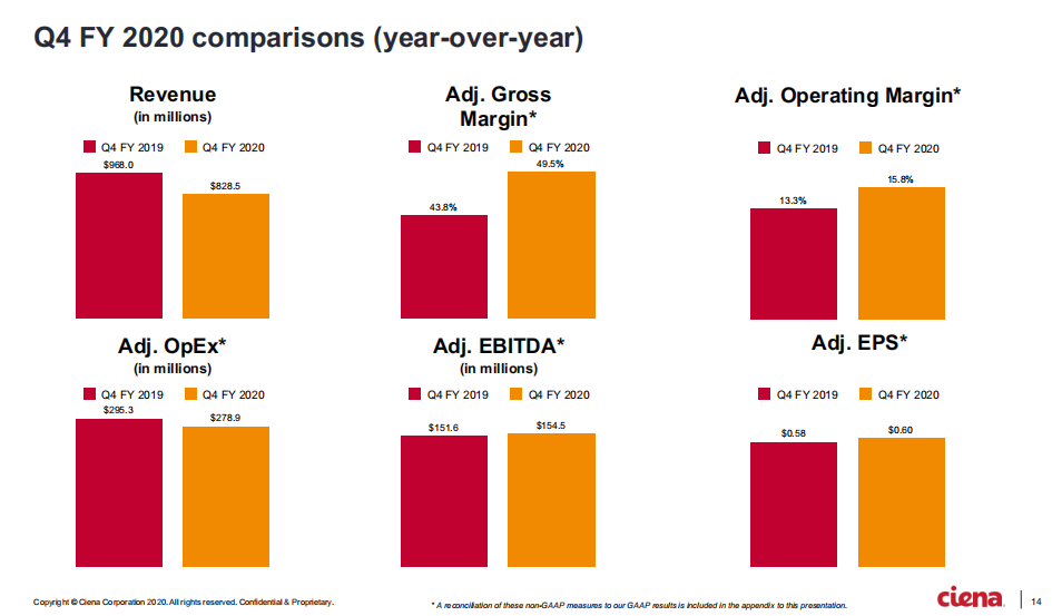 2020財(cái)年第四季度,Ciena的收入為8.285億美元,而2019財(cái)年第四季度的收入為9.68億美元。同比下滑14.41%。GAAP毛利率為48.8%,去年同期為43.4%,同比增長5.4%。非GAAP毛利率49.5%,去年同期為43.8%。GAAP凈收入為6500萬美元,每股盈利0.42美元,去年同期凈收入為8031萬美元,每股收益0.51美元。2020財(cái)年第四季度非GAAP凈收入為9450萬美元,每股盈利0.6美元,去年同期非GAAP每股盈利0.58美元。