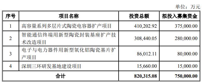 據(jù)了解,本次調(diào)整由先前的四個項目:高容量系列多層片式陶瓷電容器擴產(chǎn)項目、智能通信終端用新型陶瓷封裝基座擴產(chǎn)技術(shù)改造項目 、電子與電力器件用新型氧化鋁陶瓷基片擴產(chǎn)項目 、深圳三環(huán)研發(fā)基地建設(shè)項目調(diào)整成兩個項目:高容量系列多層片式陶瓷電容器件擴產(chǎn)項目、深圳三環(huán)研發(fā)基地建設(shè)項目。此次調(diào)整后,擬募集資金總額由不超75億元調(diào)整至不超39億元。