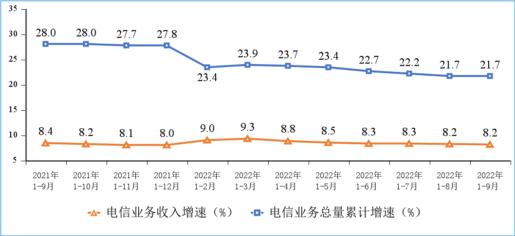 圖1 電信業(yè)務(wù)收入和電信業(yè)務(wù)總量累計(jì)增速