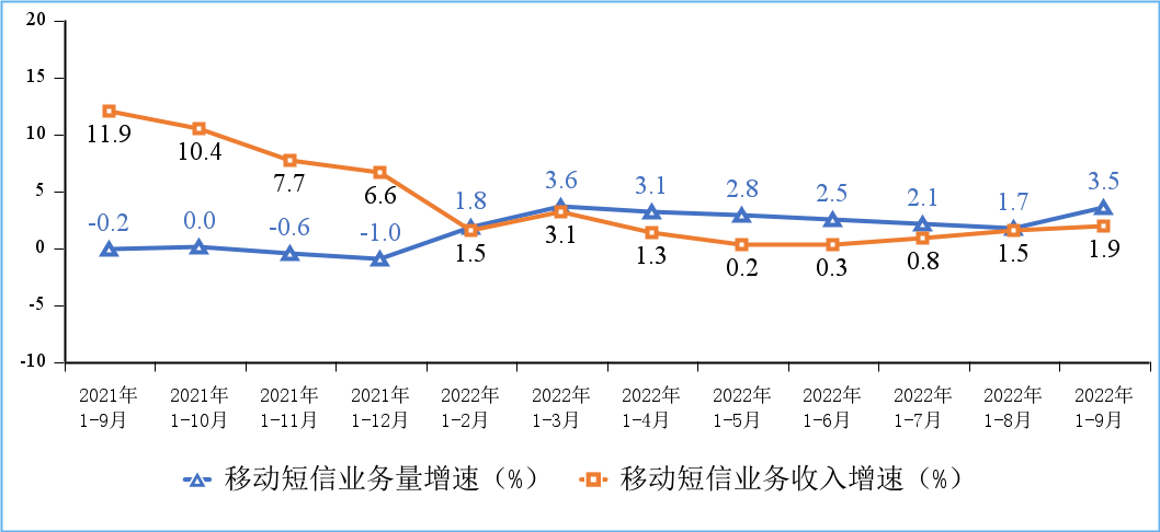 圖8 移動(dòng)短信業(yè)務(wù)量和收入同比增長情況
