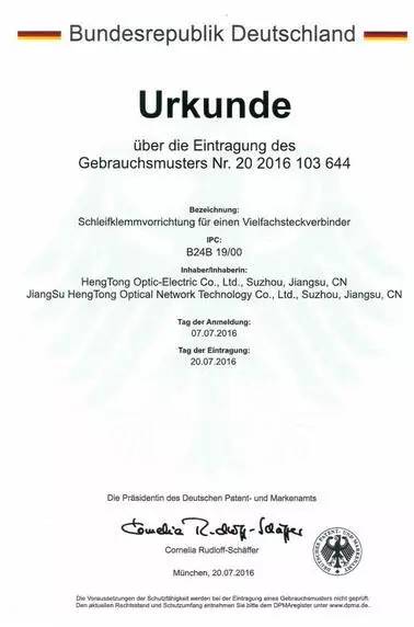 Iccsz訊 近日,亨通通信產業(yè)集團江蘇亨通光網科技有限公司“一種適用于云計算多芯連接器的研磨夾具裝置”PCT專利授權并榮獲德國授權證書。