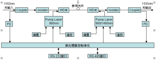 泵浦光源(pump-LD)、光無源器件組成;輔助電路主要包括電源、微處理自動控制單元、監(jiān)控接口和告警及保護(hù)電路,輔助電路的協(xié)調(diào)工作是光放大器正常工作的前提。
