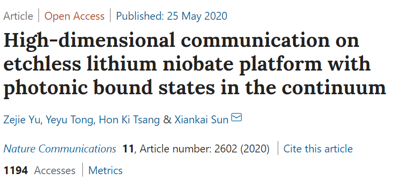Zejie Yu, Yeyu Tong, Hon Ki Tsang, and Xiankai Sun, “High-dimensional communication on etchless lithium niobate platform with photonic bound states in the continuum,” Nat. Commun. 11, 2602 (2020). https://doi.org/10.1038/s41467-020-15358-x