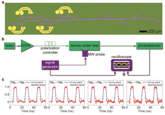 圖2. 實(shí)驗展示片上電光調(diào)制和模式復(fù)用。