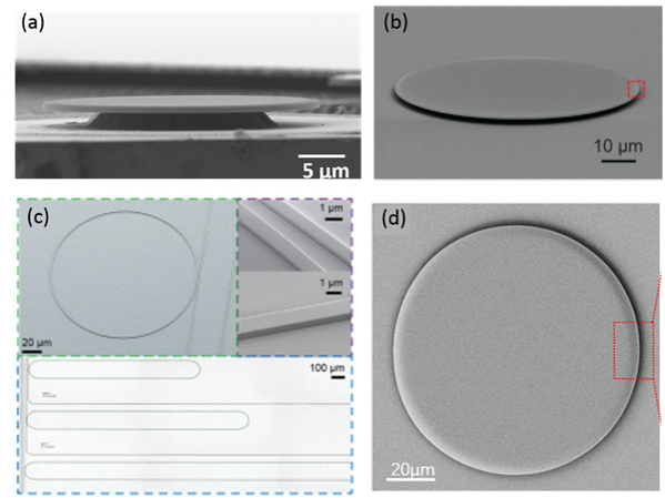 (c) 電子束曝光、氬離子刻蝕后鍍二氧化硅的微環(huán)腔;(d) 激光光刻、化學(xué)機械拋光刻蝕制備的微盤腔