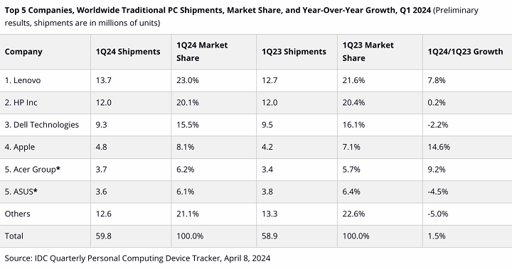IDC 最新發(fā)布的報(bào)告表明,全球 PC 市場(chǎng)在經(jīng)歷連續(xù)兩年的下滑之后,終于在 2024 年第一季度重新恢復(fù)增長,出貨量達(dá) 5980 萬臺(tái),同比增長 1.5%。