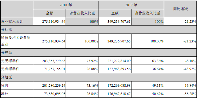 按市場劃分,報告期內,國內光纖到戶建設需求有所下降,DWDM器件需求相對平穩(wěn),下半年進入合并報表的成都迪譜PON光模塊銷售增長較快。公司2018年實現境內銷售收入2.01億元,比上年同期增長16.84%,占總銷售收入的73.16%。在境外市場方面,光分路器市場需求較為穩(wěn)定,但因為公司有源器件業(yè)務的主要境外客戶Kaiam公司進行產品結構調整,導致訂單需求大幅下降。公司2018年實現境外銷售收入0.74億元,比上年同期下降58.28%,占總銷售收入的26.84%。