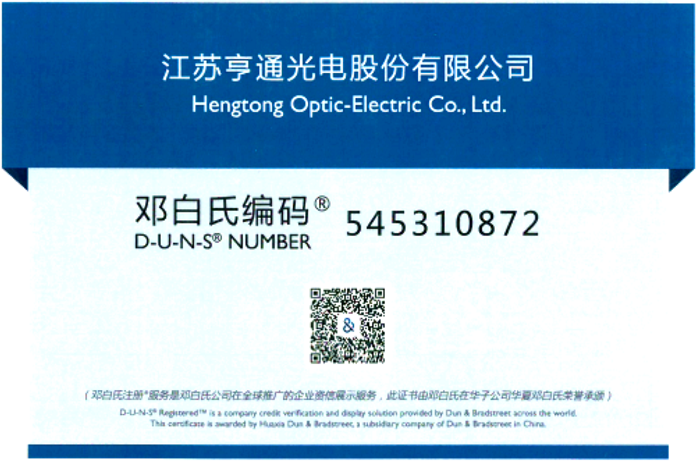 近日,經(jīng)過(guò)嚴(yán)格的調(diào)查和審核程序,亨通光電順利通過(guò)鄧白氏權(quán)威認(rèn)證,獲得自己的鄧白氏編碼:545310872,以及完整的資信檔案信息詳細(xì)的資信報(bào)告等認(rèn)證。