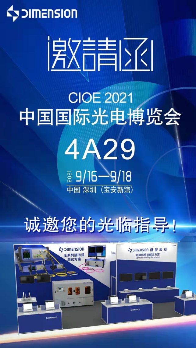 ICC訊 第23屆中國國際光電博覽會(CIOE2021)將于9月16日-18日在深圳國際會展中心盛大開幕,作為業(yè)界領(lǐng)先的光通信檢測解決方案供應(yīng)商,維度科技將為您盛裝展示多種創(chuàng)新的檢測解決方案,我們在4號館4A29。