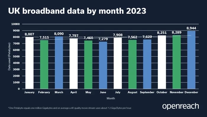 Virgin Media O2網(wǎng)絡(luò)的寬帶使用量增加了13%,這是英國(guó)第二大網(wǎng)絡(luò)。該公司還指出,在家辦公的比例正在上升,與2022年相比,傳統(tǒng)工作時(shí)間的寬帶流量增長(zhǎng)了14%。