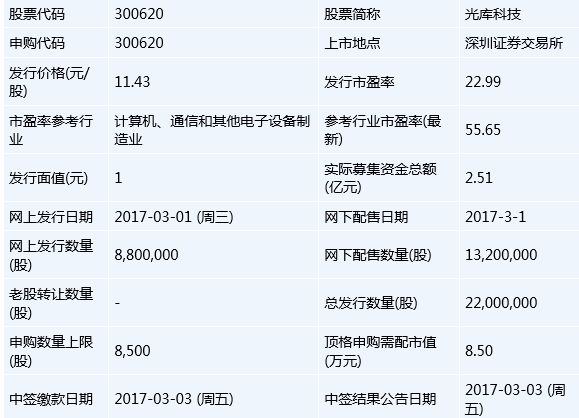 本次發(fā)行股份數(shù)量為2200萬股,網(wǎng)下初始發(fā)行數(shù)量為1320萬股,為本次發(fā)行數(shù)量的60%;網(wǎng)上初始發(fā)行數(shù)量為880萬股,為本次發(fā)行數(shù)量的40%;今日發(fā)行價格為11.43元/股,發(fā)行市盈率22.99倍。光庫科技本次發(fā)行網(wǎng)上網(wǎng)下發(fā)行申購時間為:2017年3月1日9:30~15:00;單一帳戶申購上限為8500股,申購數(shù)量500股整數(shù)倍。