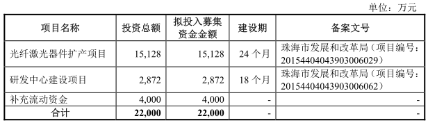 據(jù)了解,光庫科技本次募投資金總額為2.51億元,主要用于光纖激光器件的擴(kuò)產(chǎn)項目以及研發(fā)中心的建設(shè)項目。項目達(dá)產(chǎn)后,公司將新增光纖激光器件設(shè)計生產(chǎn)能力20萬個/年,滿足公司業(yè)務(wù)不斷增長的需要,大幅增加公司主營業(yè)務(wù)盈利水平;募投項目的實施將優(yōu)化公司的設(shè)計研發(fā)環(huán)境,推動高功率、保偏、有源器件的研發(fā)工作,進(jìn)一步提高公司產(chǎn)品研發(fā)和技術(shù)創(chuàng)新能力,豐富公司產(chǎn)品線。詳細(xì)情況如下表: