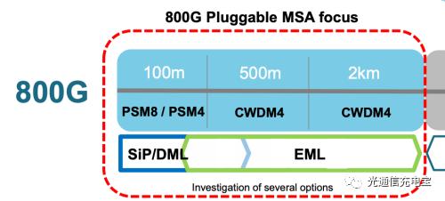 800G pluggable MSA的發(fā)起者主要是中國(guó)和日本公司,包括、光迅、中國(guó)電信技術(shù)實(shí)驗(yàn)室、H3C、海思、華為、立訊精密、住友、騰訊和山崎,當(dāng)然后來(lái)陸續(xù)還有其它公司加入。目標(biāo)是定義面向數(shù)據(jù)中心應(yīng)用的短距800G傳輸用的可插拔低成本光模塊,包括8X100G與4X200G兩種規(guī)范,傳輸距離包括100m,500m,2km,如下圖所示。