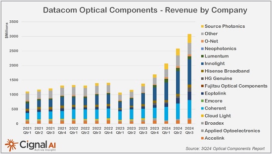 Cignal AI的《光器件報(bào)告》報(bào)告中包含的公司有Acacia、Accelink(光迅)、Adtran、ADVA、Applied Optoelectronics、Broadex(博創(chuàng))、Ciena、Cisco、Coherent、Emcore、Eoptolink(新易盛)、Fiberhome(烽火)、Finisar、Fujitsu、Furukawa Electric、HG Genuine(華工正源)、Huawei(華為)、Hisense Broadband(海信寬帶)、Infinera、Innolight(旭創(chuàng))、Inphi、Intel、IPG Photonics、Jabil、Lumentum、Marvell、Mitsubishi、Molex、NEC、Neophotonics、Nokia、OE Solutions、PacketLight、SONT Technology(迅特)、Source Photonics、Sumitomo、Sumitomo Osaka Cement和ZTE(中興通訊)。